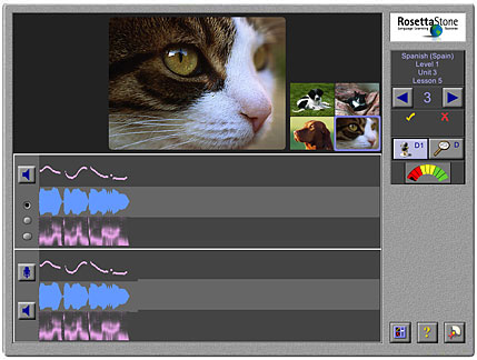 Rosetta Stone teaches Spanish through a step-by-step sequence of carefully structured lessons, called Dynamic Immersion™. New words become associated with familiar objects, actions, and ideas. Words build to phrases and sentences in a systematic progression.